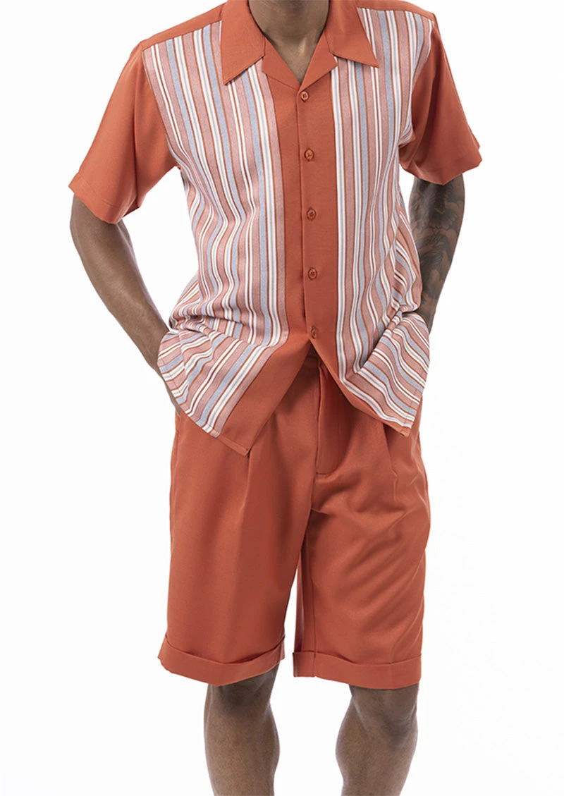 Papaya Tone On Tone Stripes Walking Suit 2 Piece Short Sleeve Set With Shorts