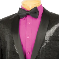 Slim Fit Black Shiny Sharkskin Party Jacket With Silver Sequins Lapel